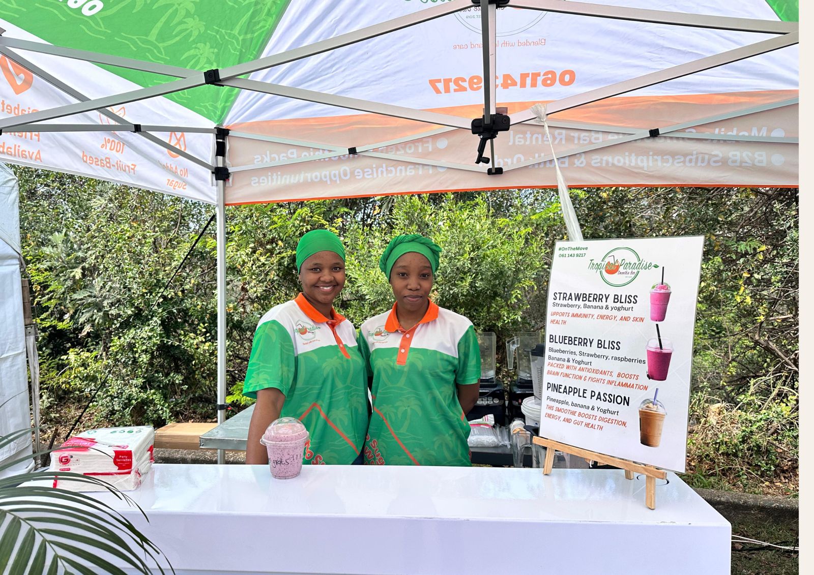Elevate Your Event with Purposeful Nutrition with our Mobile Smoothie Bar. Whether you’re hosting a corporate wellness day, organizing a marathon, or leading a Pilates retreat, Tropical Paradise Smoothie Bar brings energy, vibrancy, and health directly to your event. We don’t just serve smoothies, we create wellness experiences. This catering order is for 100 people and it includes 2 staff members on site, 3 smoothie flavors,1 custom menu.